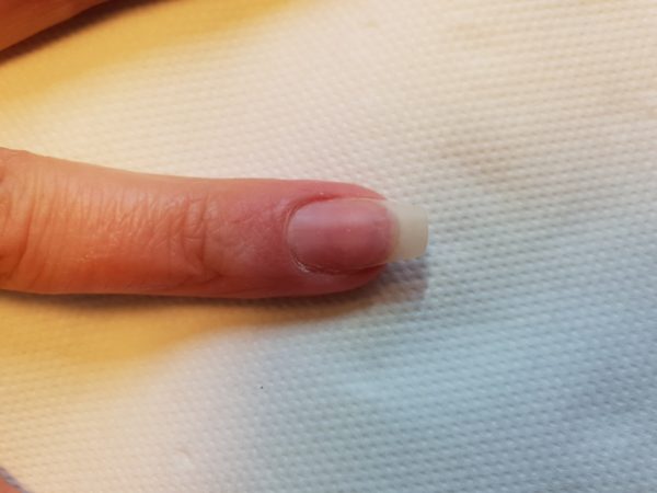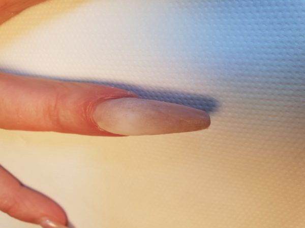 Prepare the natural nail for acrylic application and use Cuccio Acid Primer Pen.