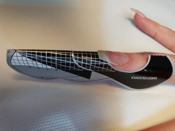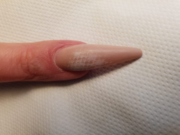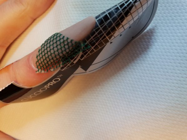 Apply Cuccio Nudecrylics colour of choice to the whole nail. While still wet, press a piece of net into the acrylic.