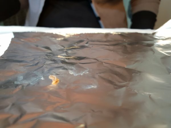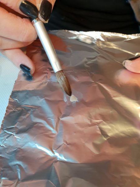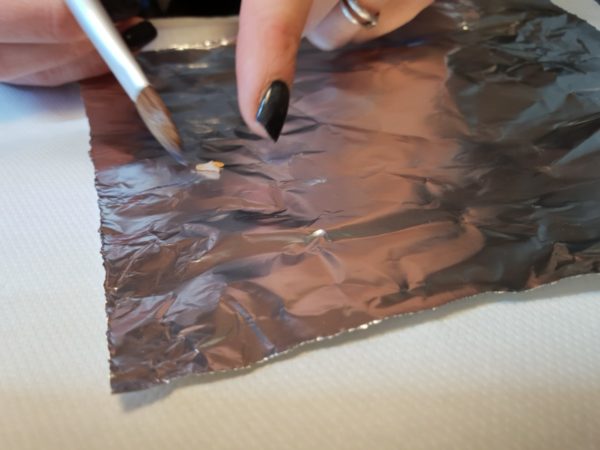 Prepare your roses. Use foil as your platform to work from. Pick up a small bead of acrylic and place on the foil in a small ball.