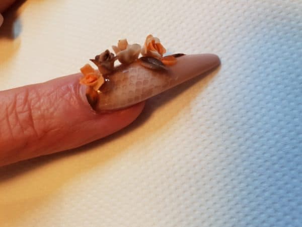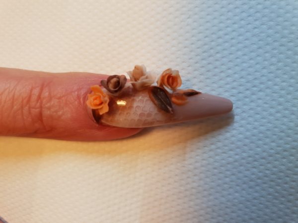 Recreate this 3d floral look by Lisa Dunlop using Cuccio’s Ultra Clear Monomer and the Nudecrylics range…