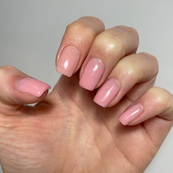 Prep the nails and push back the cuticles. Shape and buff the natural nail bed with a grey and yellow buffer. Dust and wipe the nails with GELLUX Prep and Wipe. Apply a thin layer of GELLUX Fast Bond. Then, apply two thin layers of GELLUX Builder Gel in Rose Pink, curing each layer for 60 seconds. Wipe off any sticky access with GELLUX Prep & Wipe.