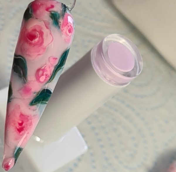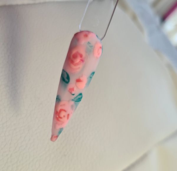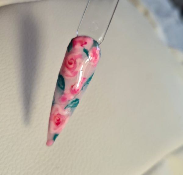 Wipe sticky layer and highlight using Mint Tint White Art Gel, defining the leaves. Use more of the shades Kiss Me and Piglet to highlight the roses then cure. Top with one coat of Mint Tint Shiny Top Coat to finish and cure