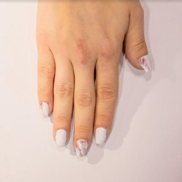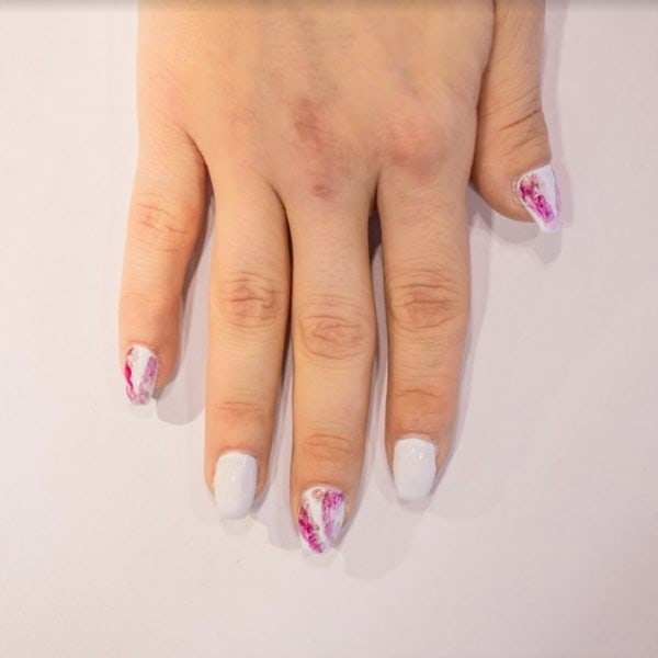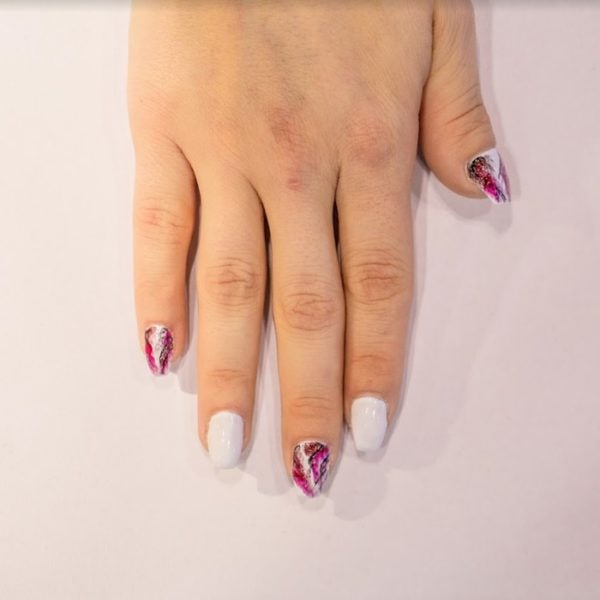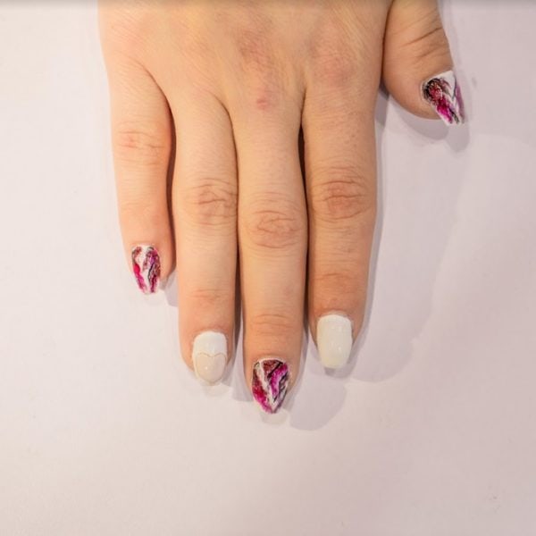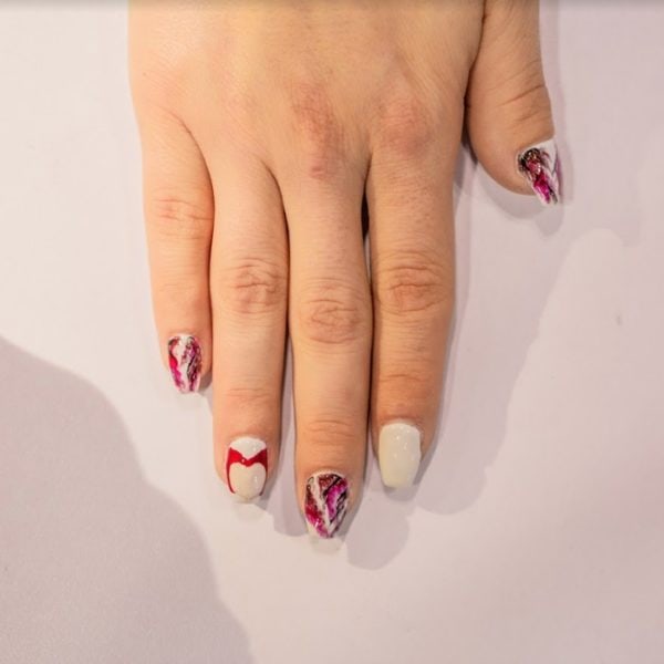 Painting the nails with two coats of Flawless White, curing after each coat. Take a liner brush and lightly create abstract lines with a mixture of Flawless White and Royal Red followed by Encore, flash curing after each.