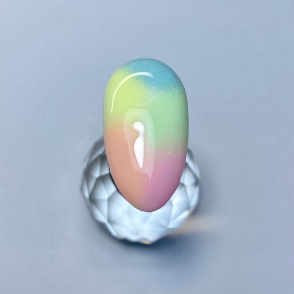 Using your pigments, dab a small amount into random sections of the nail until you have completely covered the white. I used INK London’s Neon pigments in the shades Rachel, Fiona, Clare and Laura plus Amy, each mixed with white pigment Audrey to create the softer pastel colours. Gently remove any excess pigment with a soft brush and apply Rock Light Plus topcoat, ensuring you have enough topcoat on your brush to ’float’ over your design to avoid dragging the pigments. Cure for 60 seconds.
