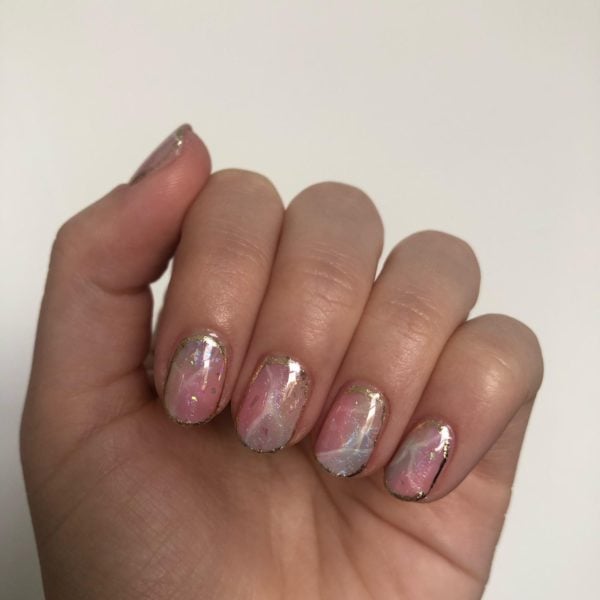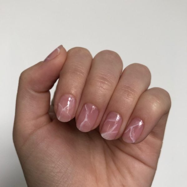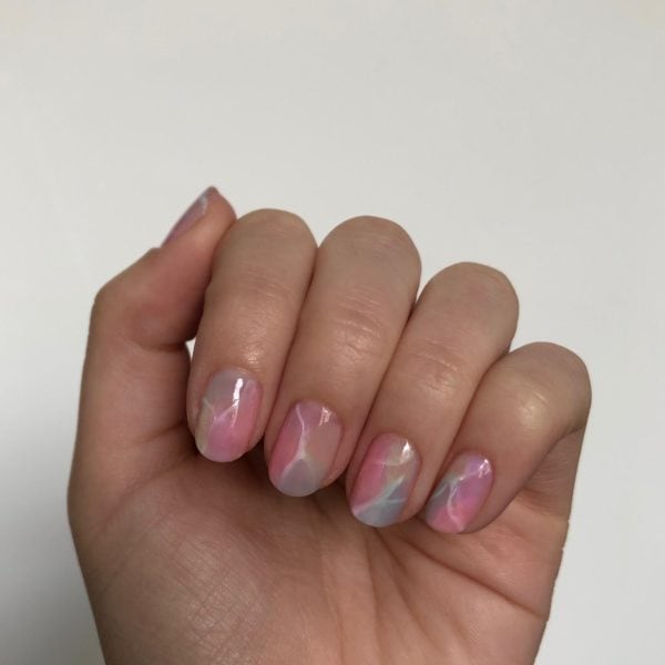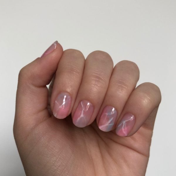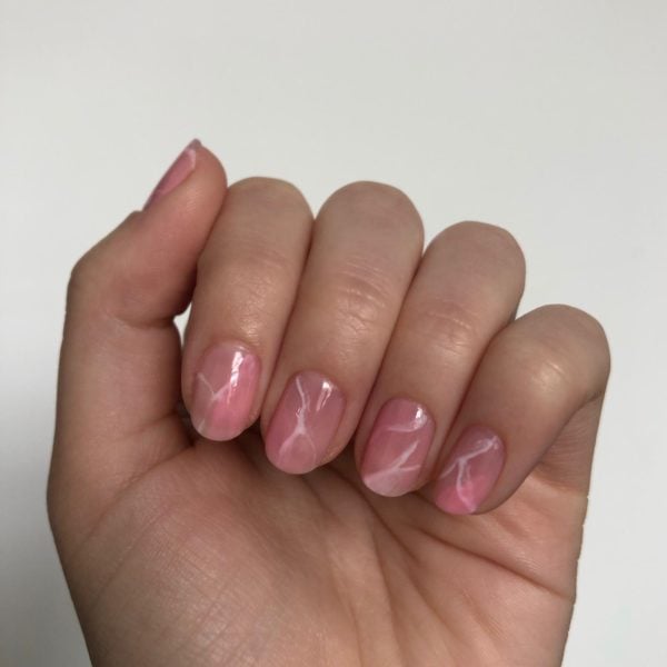 Next, mix an equal amount of GELLUX Sweetie Pie in with GELLUX Clear Base And Top Coat, (you want it to be sheer enough to see the white lines through) and paint a section randomly onto each nail. Do not cure.