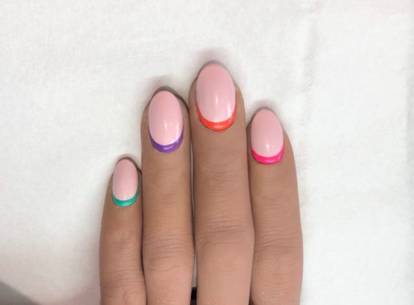 Offer a summer inspired twist on the classic French with this Rainbow Reverse French using Gellux from Salon System nail expert Julie-Anne Larivière…
