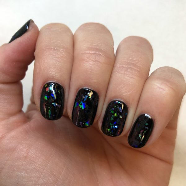 Next, dab Iridescent/Rainbow Foil randomly onto the nail followed by a coat of GELLUX Base and Top Coat.