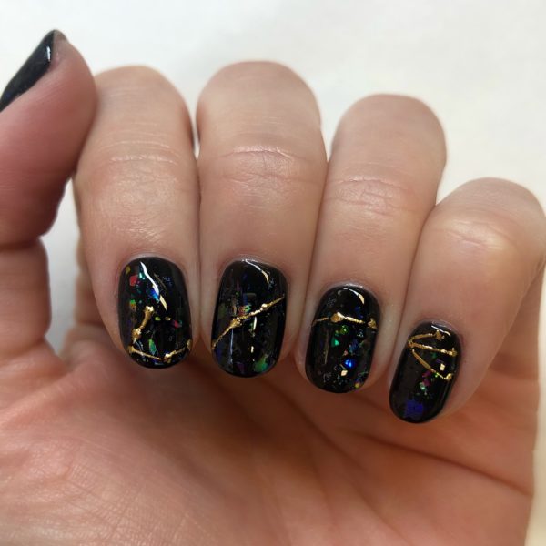 Wipe over the nails with acetone, and then use NSQUK Stick It gel to draw on the Scorpio constellation design across all four nails. Cure for 60 seconds and then dab gold foil on top. To complete the look, apply a coat of GELLUX Base and Top Coat, cure, and then wipe over with GELLUX Prep + Wipe. Finish by applying GELLUX Nail & Cuticle Oil.