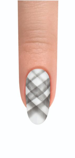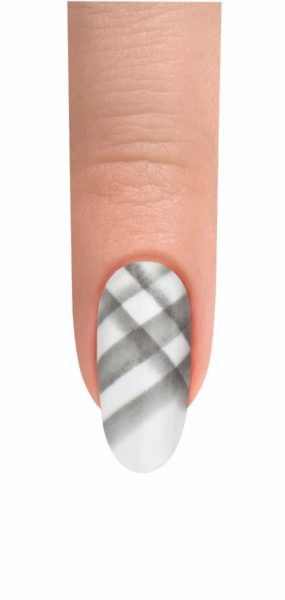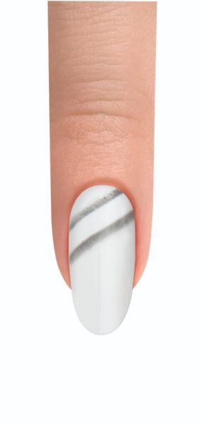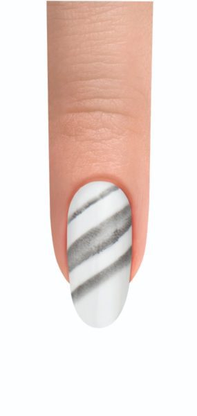Using a Striping Tape, place the strip diagonally across the nail. Apply a coat of Black Shadow on a sponge and lightly dab on the strip.