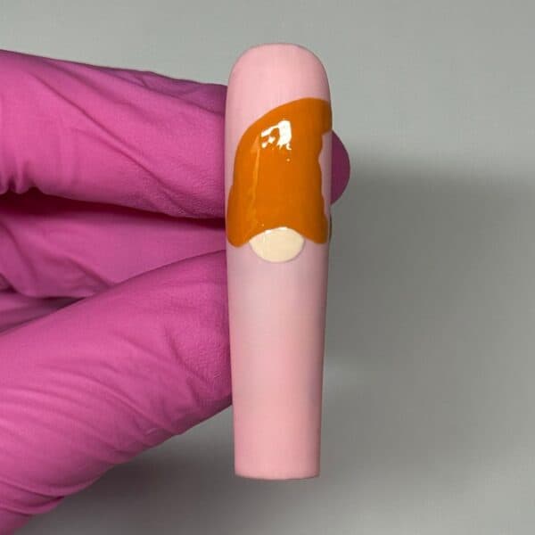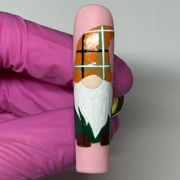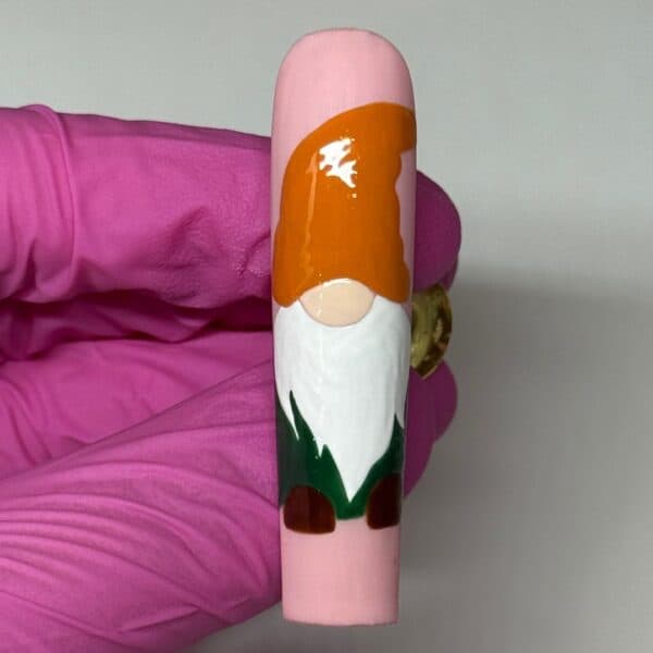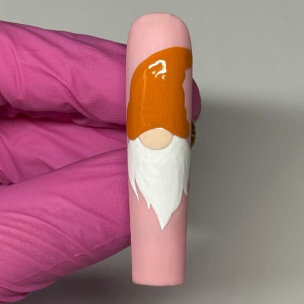 Apply two coats of muted pink gel polish (I used Gems Gel Polish in Jodie), curing after each coat. Apply a matte top coat, cure, then paint the gnome’s hat using a nail art brush and orange gel polish. I used Gems Gel Polish in Ginger for the hat, then opted for Gems Gel Polish in Rose for the gnome’s nose. Cure after each colour application.