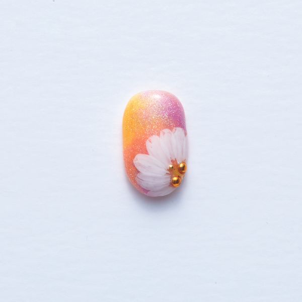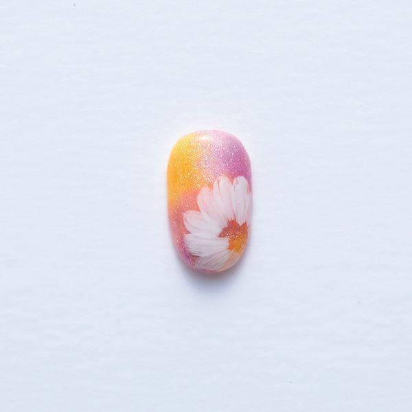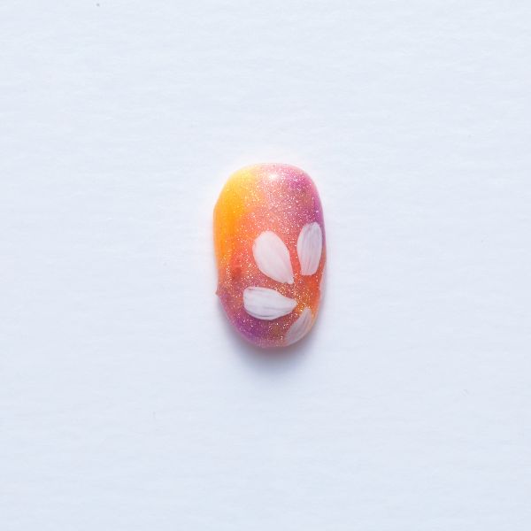 Paint flower petals onto the nail using a white gel polish with a round brush. Cure.