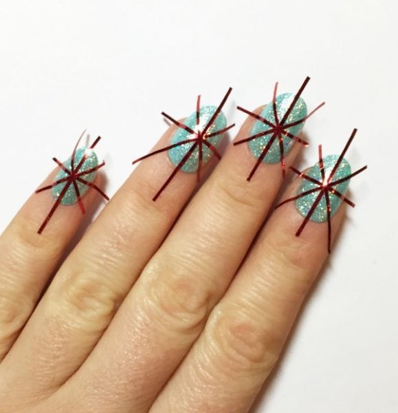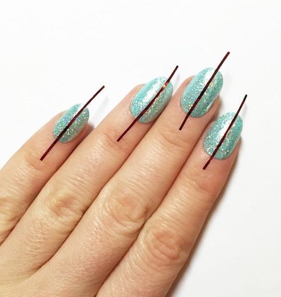 When the nails are dry, apply striping tape down the centre of each and press firmly onto the nail.