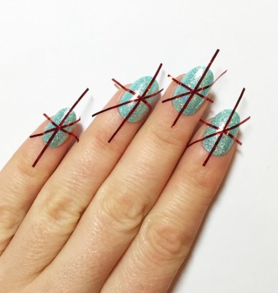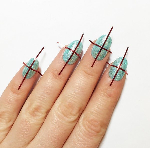 Apply striping tape across the nail to create a cross shape, again pressing firmly onto the nail.