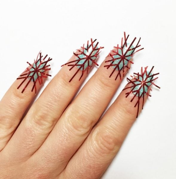 Using tweezers, lift off the striping tape, one nail at a time. Take off the 'V' shape branches of the snowflake first, then take off the piece of striping tape that you applied last and then the piece before and so on. If you don't do it in this order, you could ruin the design. The polish should be slightly wet when you remove the tape to give a cleaner finish to the lines.
