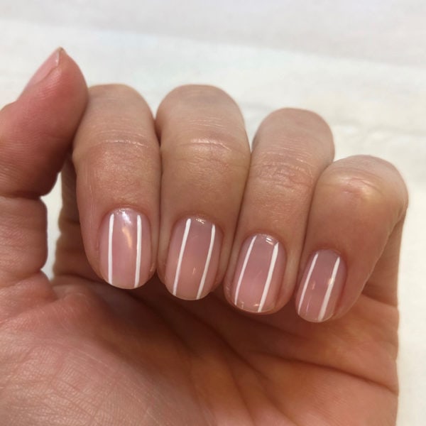 Using GELLUX Purely White, paint two vertical lines down each nail plate and cure for 30 seconds.