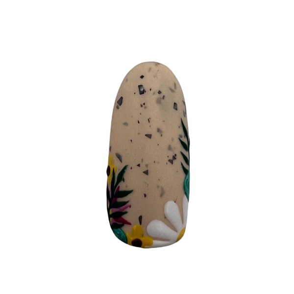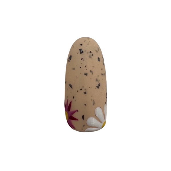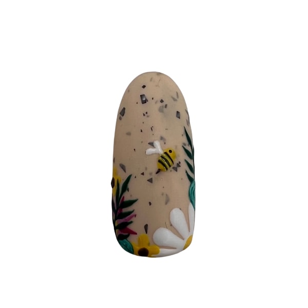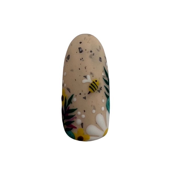 Lecenté educator, Kimberly Johnstone of Lillie Beau Nail Salon, serves up this spring-inspired floral nail design, complete with bees over a speckled base.