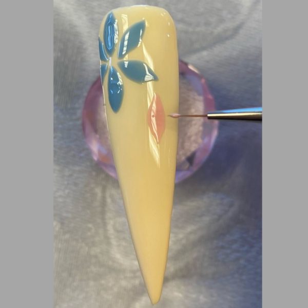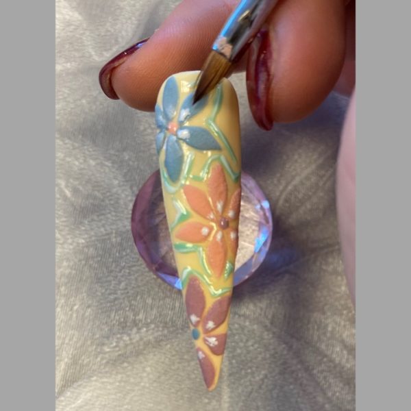 Add further highlights in the centre of the flowers and over the sides and tips of the petals. Cure and finish the nails with the Halo Gel Polish Non Wipe Top Coat.