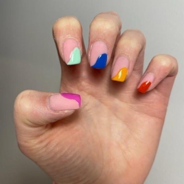Apply the GELLUX Free Spirit collection to the tip of each nail, using pink Glorious and Free, green Go With The Flow, blue Joie De Vivre, yellow Be A-‘Maize’ing, and red Maple Dreams Come True. Cure for 60 seconds.