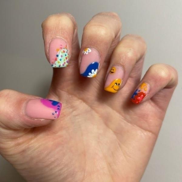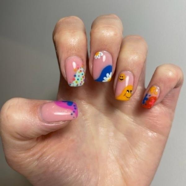 Salon System nail expert and owner of The Nail Fairy, Caroline Roberts, has created a step-by-step for this funky, spring happiness themed set.