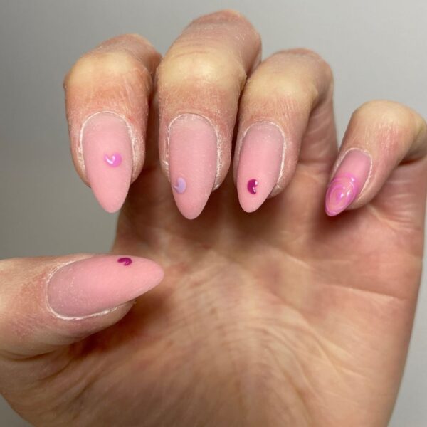 Using a dotting tool, place a dot of Gellux Mini in Berry Burst on the thumb, Gellux Mini in Flirty Fuchsia on the index finger, Gellux Mini in Dusty Lilac on the middle finger, Gellux Mini in Berry Burst on the ring finger and Gellux Mini in Flirty Fuchsia on the little finger. Slightly drag each dot to create a tail and cure for 60 seconds.
