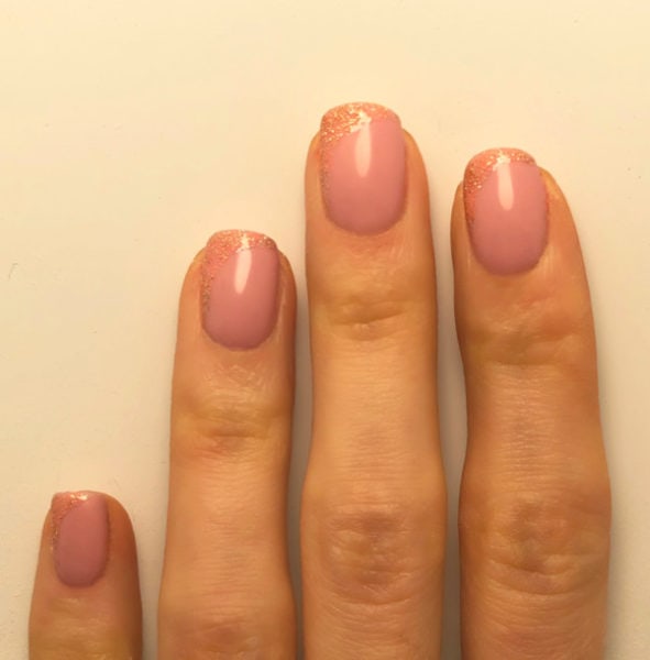 Apply a gold gel polish to the tip and up the left side of each nail. Cure.