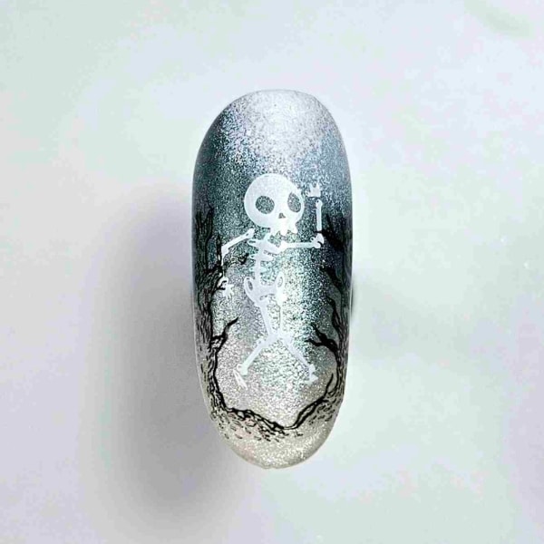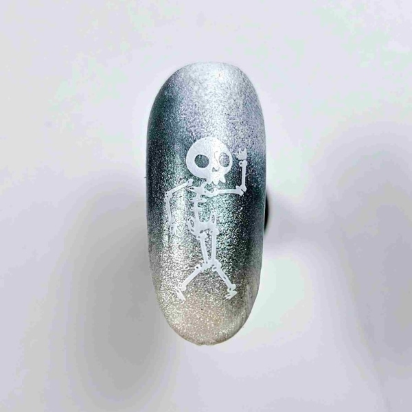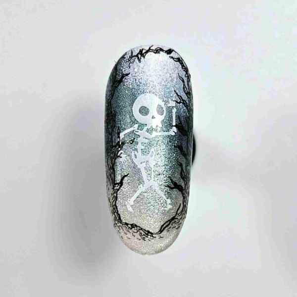 Taking the Stamping Plate in 114 Free Falling, add the Stamping Polish in White to apply a dancing skeleton stamp.