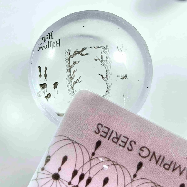 Using the Moyra Stamping Plate in 55 Fall, apply Stamping Polish in Black and cure. Apply the bat using Stamping Plate in 114 Free Falling and Stamping Polish in Smart Black. Apply top coat and cure.
