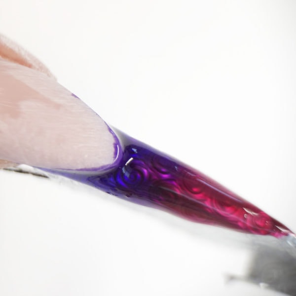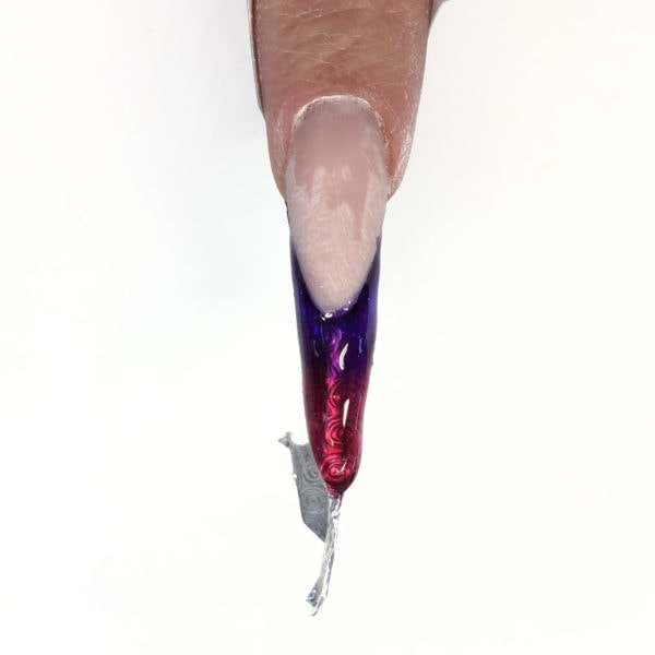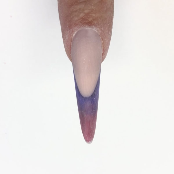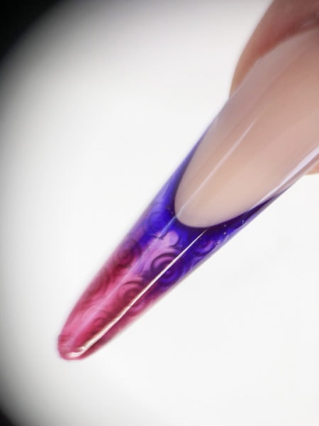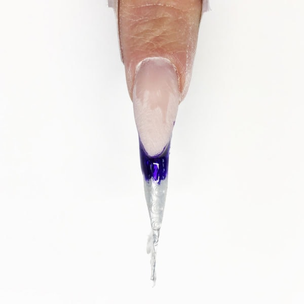 Apply a purple glass gel along the smile line and fade it out over the extension edge. Do not cure.