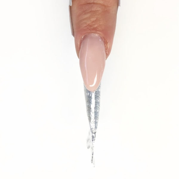 Apply a thin layer of clear gel to the nail plate and create the extension edge. It is also possible to use liquid and powder here or an acrygel product. Ensure that the clear you choose to use is really clear to achieve the best effect.