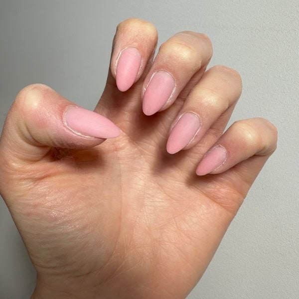 Prep the nails and push back the cuticles. Shape and buff the natural nail bed with a grey and yellow buffer. Dust and wipe the nails with GELLUX Prep and Wipe, then apply two thin layers of GELLUX Builder Gel Rose Pink, curing each layer for 60 seconds. Lightly buff the nails for a matte look, then use a nail brush to remove any dust.