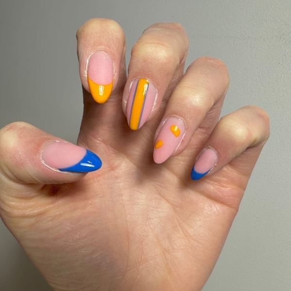 Using a fine art brush, apply GELLUX Mini Inky Blue to create a French tip on the thumb and on the little finger. Then again, using a fine line art brush, apply GELLUX Mini Lemon Meringue to the index finger creating a French tip. Next, apply again GELLUX Mini Lemon Meringue and paint a strip down the middle finger. Cure each layer for 60 seconds.