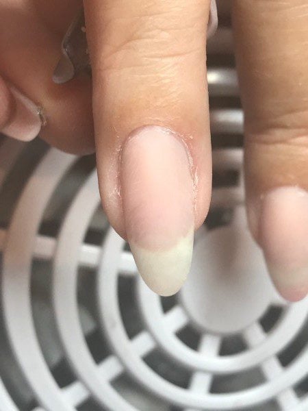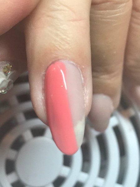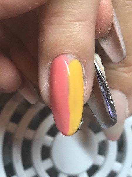 Apply Akzentz Luxio in Precocious to one half of the nail. Do not cure.