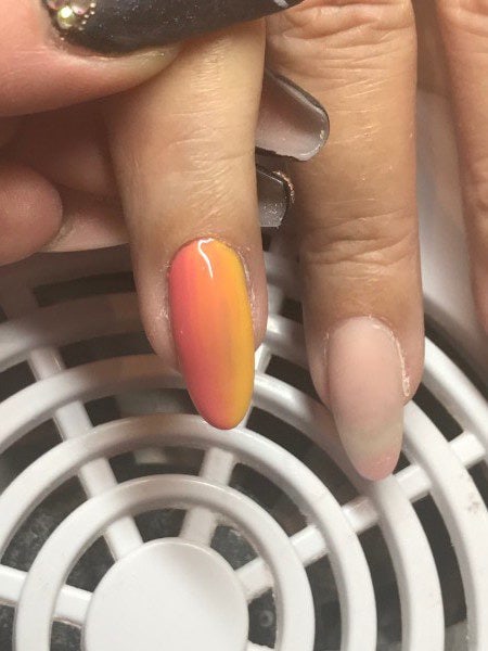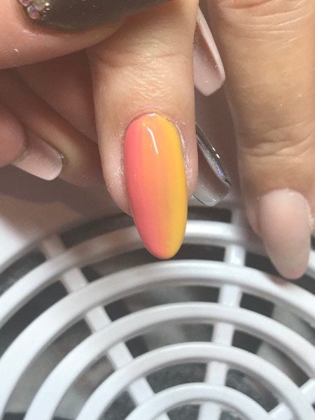 Using a dry brush, blend the two shades together. Cure for 60 seconds.