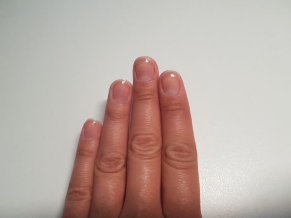 On the middle finger and thumb, polish the whole nail using Midnight Satin then cure. Repeat, making sure to cap the free edge of the nail. Cure.