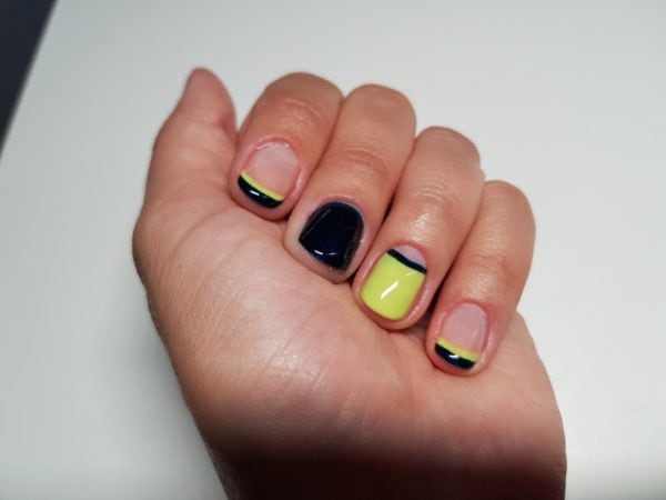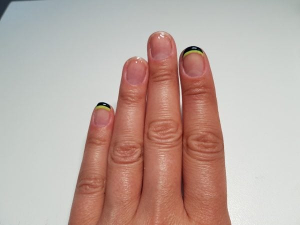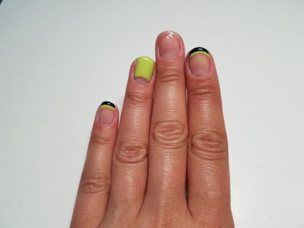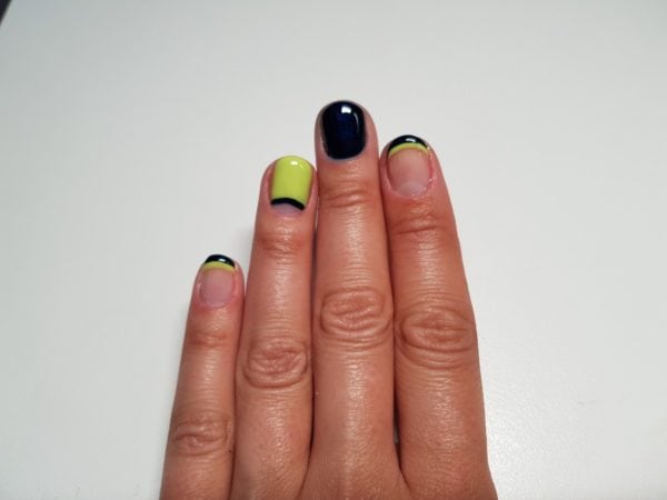 Drop a small amount of Gellux Lime Sorbet and Gellux Midnight Satin onto a piece of silver foil. Firstly, using Lime Sorbet with a striping brush, create a French tip on the index and pinky finger. Paint a slightly larger line for an exaggerated effect. Cure.