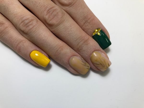 On the two nails without colour, apply Crystal Nails AquaInk drops in yellow and green. Allow to air dry, then apply a coat of Cool Top Gel and cure.