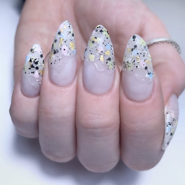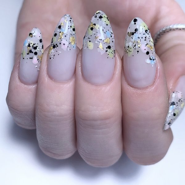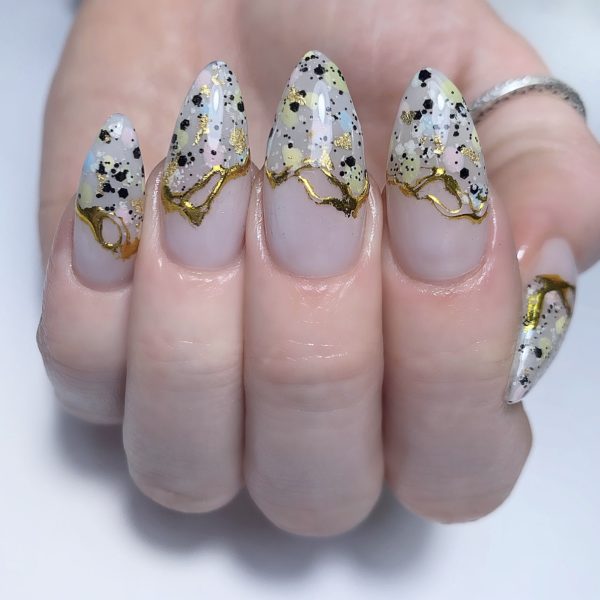 Make sure the nails are free from any tacky layer. Apply foil randomly at the edge of the terrazzo design. Cure.