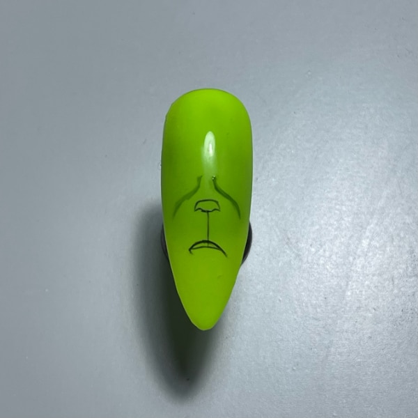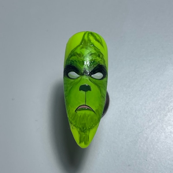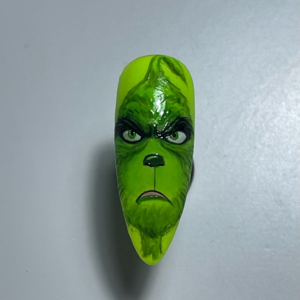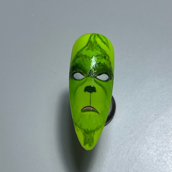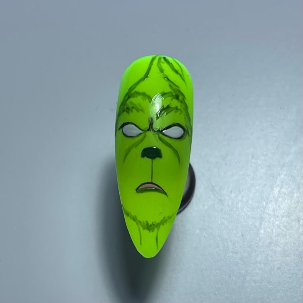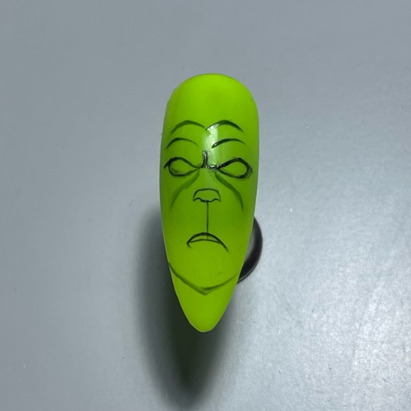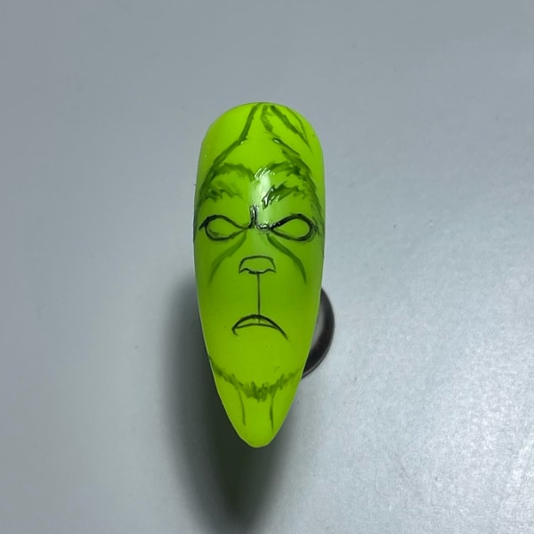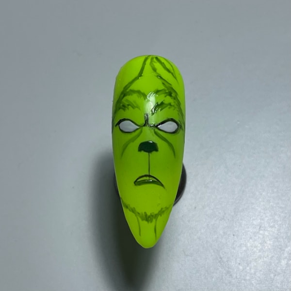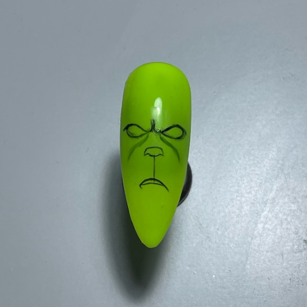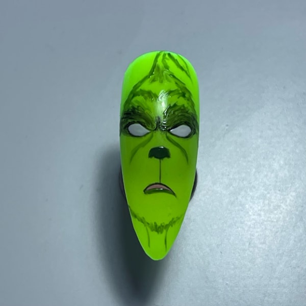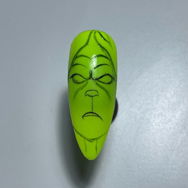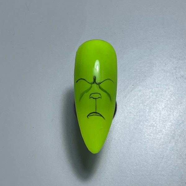 Using the same dragging technique, paint the rest of the Grinch's face with a green gel that is a few shades lighter, apart from around his nose. Cure.