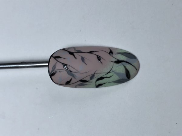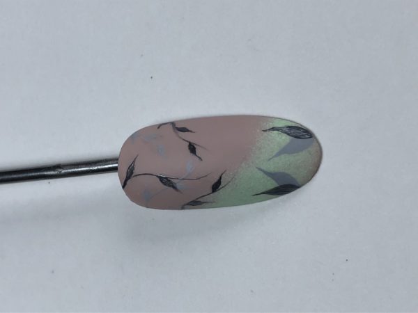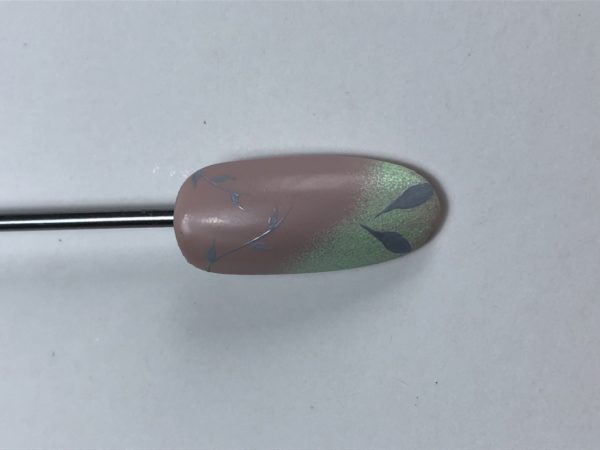With gel paint, mix 2 shades of grey – a light grey and a darker shade. Using the lighter grey, start to paint leaves and branches. Cure, apply a matte topcoat and cure. Wipe away the inhibition layer.