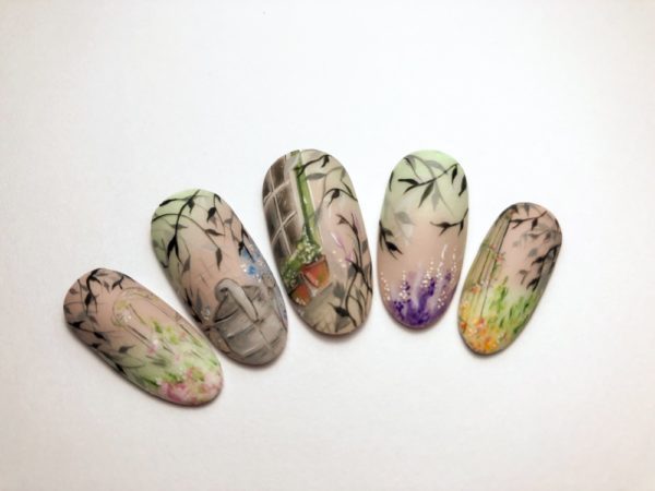 My inspiration came from the rustic gardens of the Lakes. I wanted to give my design the feel of looking through leaves into a secret garden,” reveals Melanie Lewendon. “Between each layer of leaves, I used a matte top coat layer to magnify the art work.”