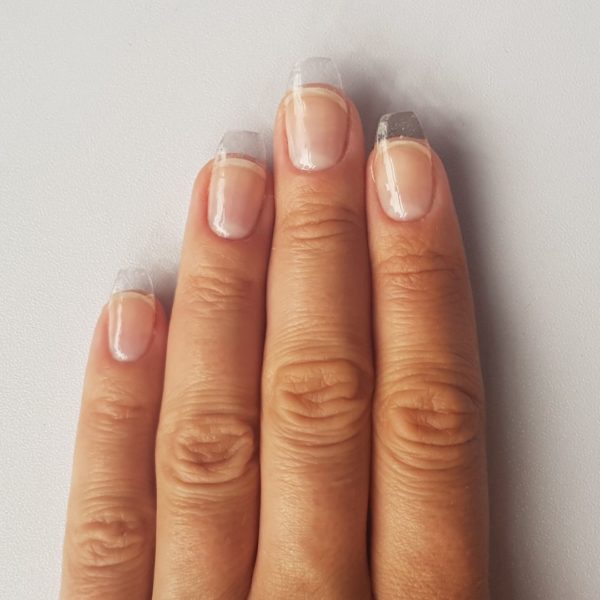 At the base of the ring finger nail, create a half moon shape in GELLUX Boy Trouble, then using GELLUX Girlfriends create a curved line but making sure to leave a gap at the free edge. Then follow on your design with GELLUX Sugar Addiction, GELLUX Gossip Girl and GELLUX BFF.