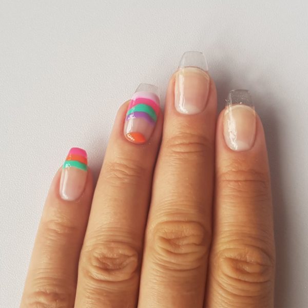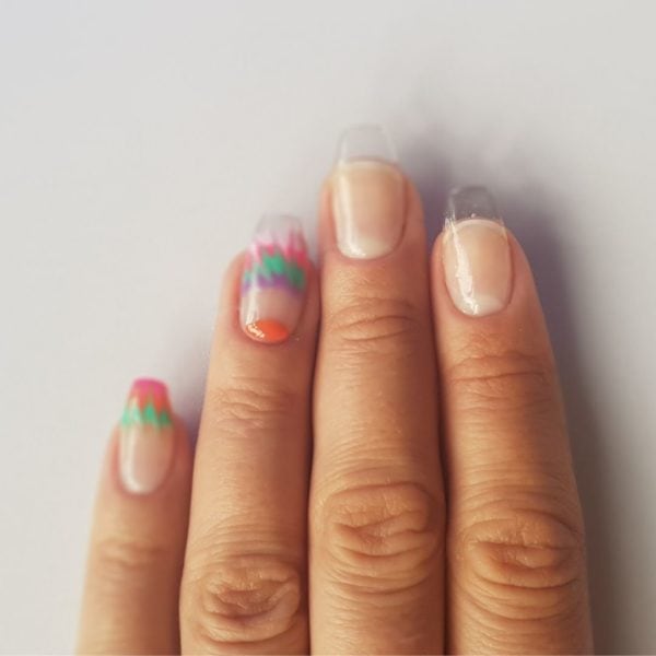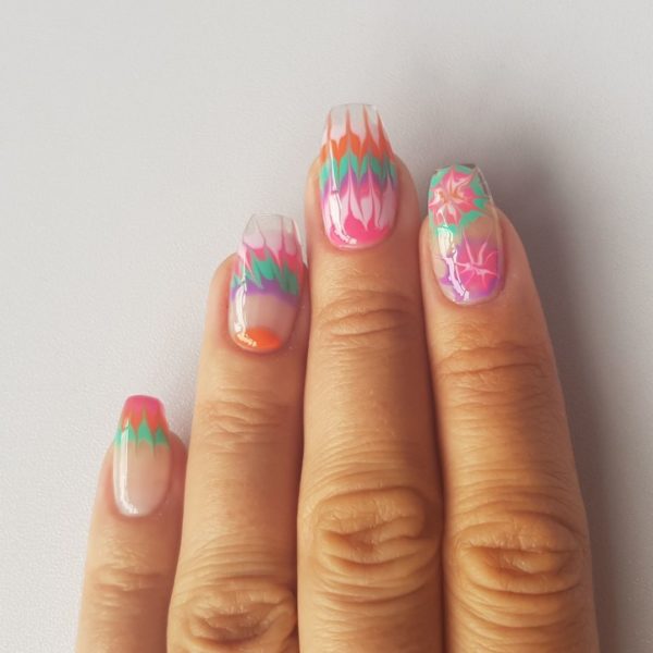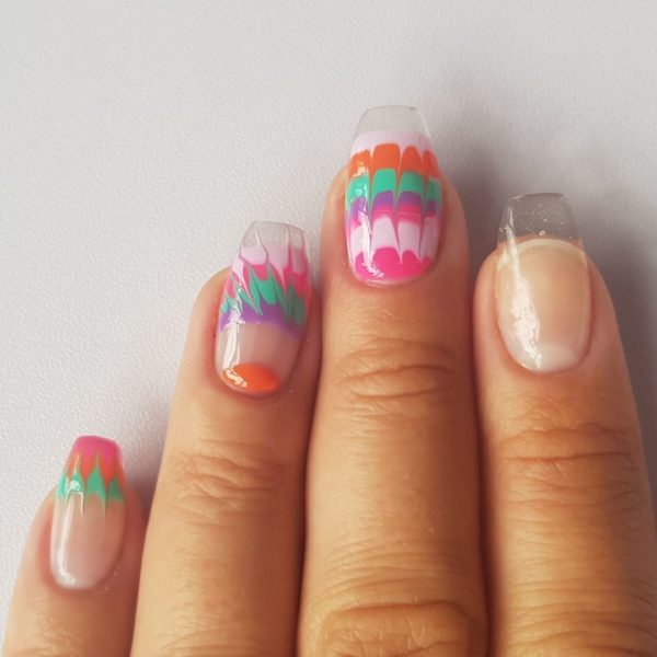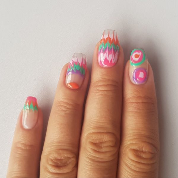 Using a small dotting tool or an orange stick, drag your tool through the design towards your cuticle area leaving a gap big enough to drag the design back the other direction towards the free edge to create a tie dye effect, making sure each time you drag the design you wipe your tool clean, then cure.