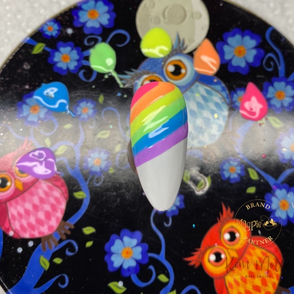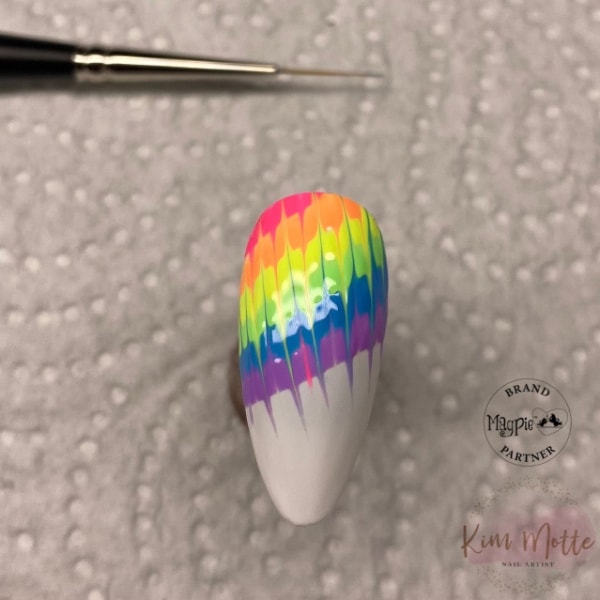 With your striping brush, gently pull the very tip of the bristles down through the colours from the top corner and into a point. Wipe your brush clean after every stroke to keep your colours sharp. Repeat this method across the nail. Do not cure.