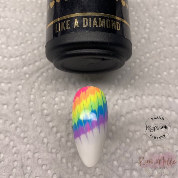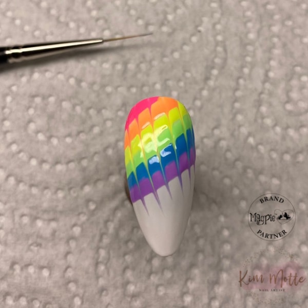 Between each downwards stroke, gently trail the tip of your bristles up through the colours to change the direction. Be sure to clean your brush after every stroke to keep the colours sharp. Repeat across the bands of colour until complete, and then cure.