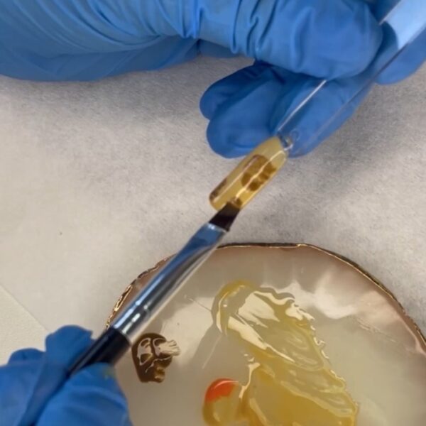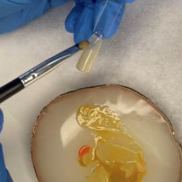 Apply a thin coat of this shade, then cure. Apply one more layer and cure before your final base layer of the shade, which you need to leave uncured. This will allow your tortoiseshell spots to bleed and blend into the base in the next step.