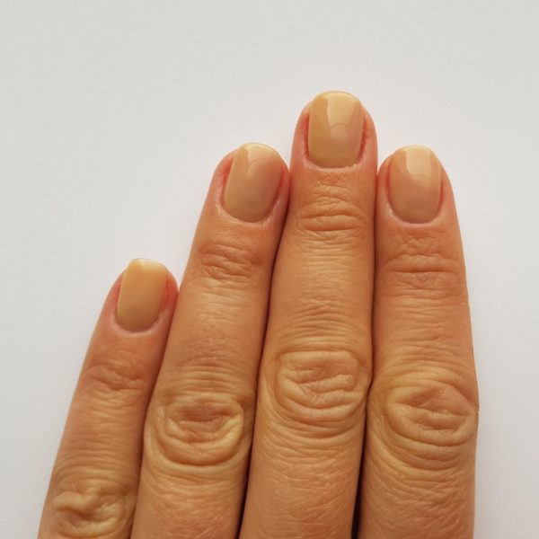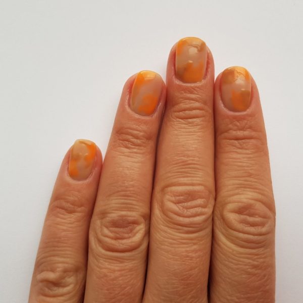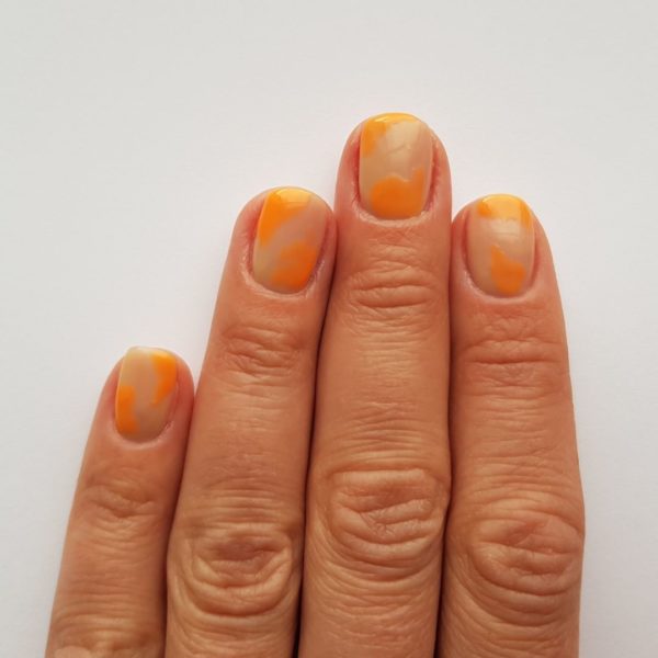 On a piece of foil put some GELLUX Matte Base/Top Coat (about the size of a 10p), add in the GELLUX Orange-A-Peel and mix together. Apply some random patches to the nails, trying not to smudge.
