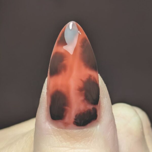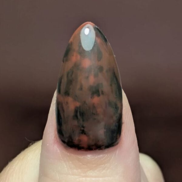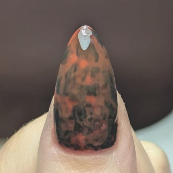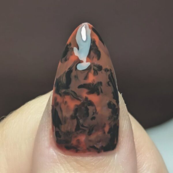 Add blobs of Hara Professional Gel Polish in Ebony randomly across the nail. Let them bloom naturally to create an organic mottled effect. Use a brush to lightly blend and texture the blobs. Cure for 60 seconds in the Hara Pro LED/UV Nail Lamp.