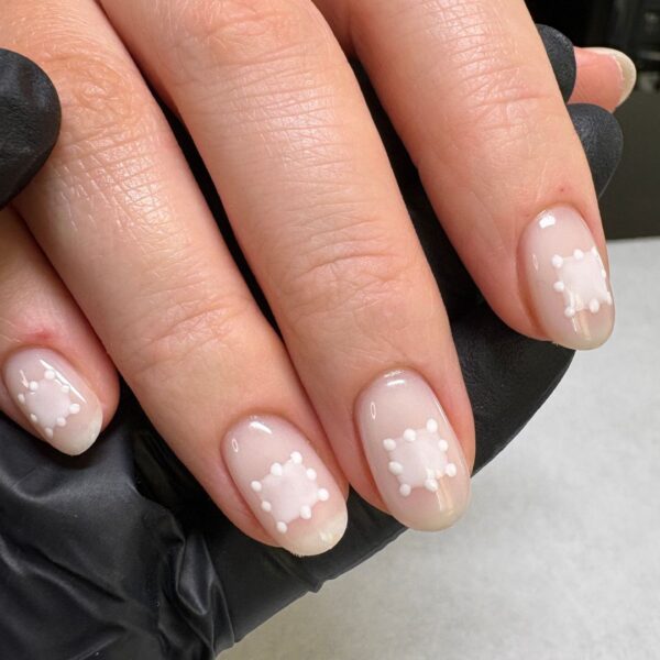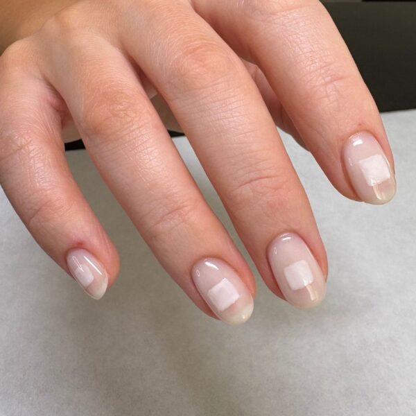 Prep the nails, apply Care + Protect Gel Base Coat and cure. Apply two coats of Statement Gel in Sheer Elegance, curing after each application. Use a thin nail brush and Statement Gel in Only Say Yes to create a rectangular shape in the centre of each nail. Cure.