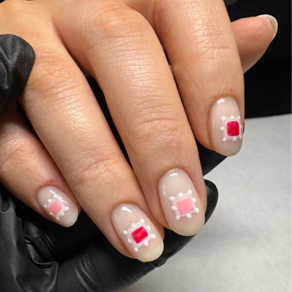 Using Statement Gels in Fondant Fancy and Indulgent Heart, add a colourful square to the centre of each stamp shape, and cure. I used Fondant Fancy on the pinkies, middle fingers and thumbs, and Indulgent Heart on the index and ring fingers.