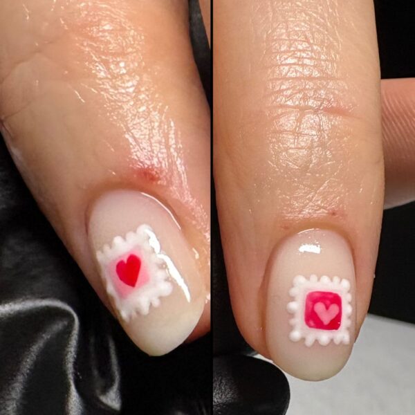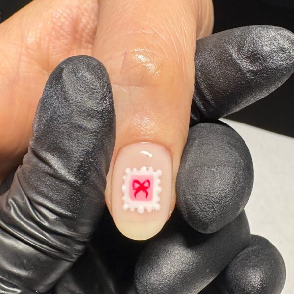 Using a thin nail art brush and Statement Gel in Indulgent Heart, paint a bow in the centre of each thumb stamp. Cure.